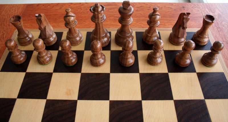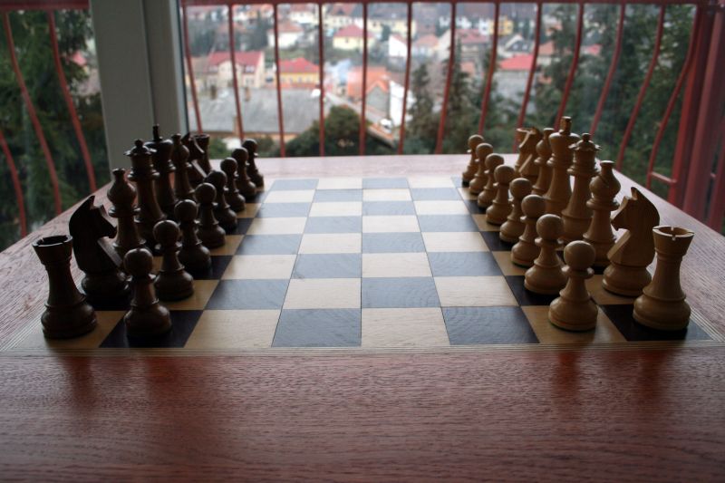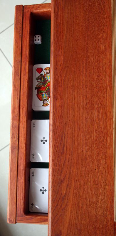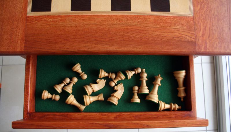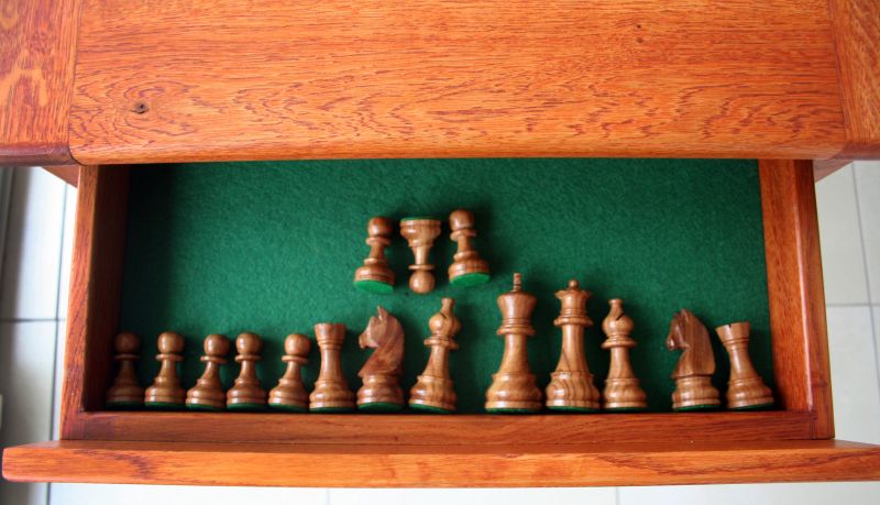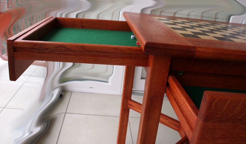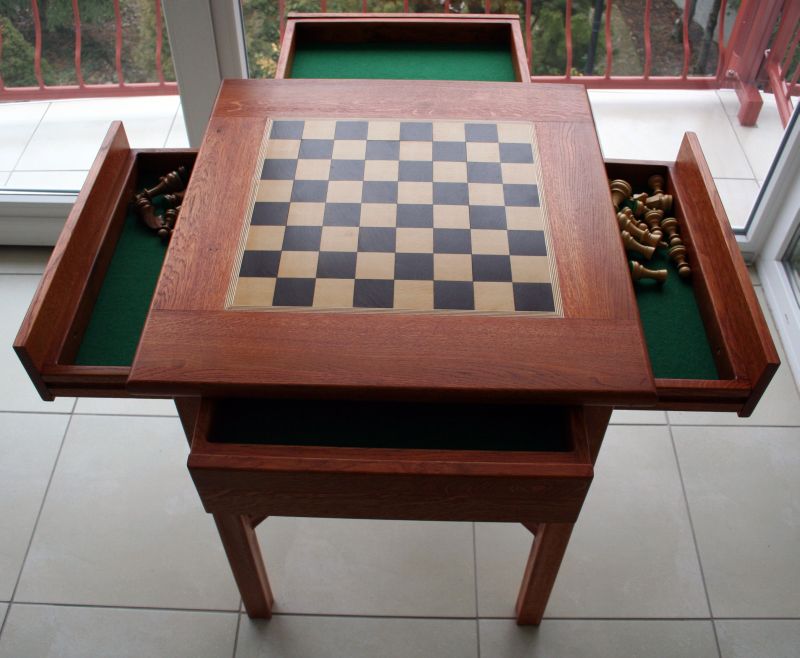 Tölgyfából készültek a lábak és az asztallap kerete. A sakktábla 15 mm vastag dió és juhar mozaik, melyet orosz nyír rétegelt lemez keretez. A tölgy részek pácoltak, az egész olajozva és viaszolva van. A fiókok alja filccel borított.